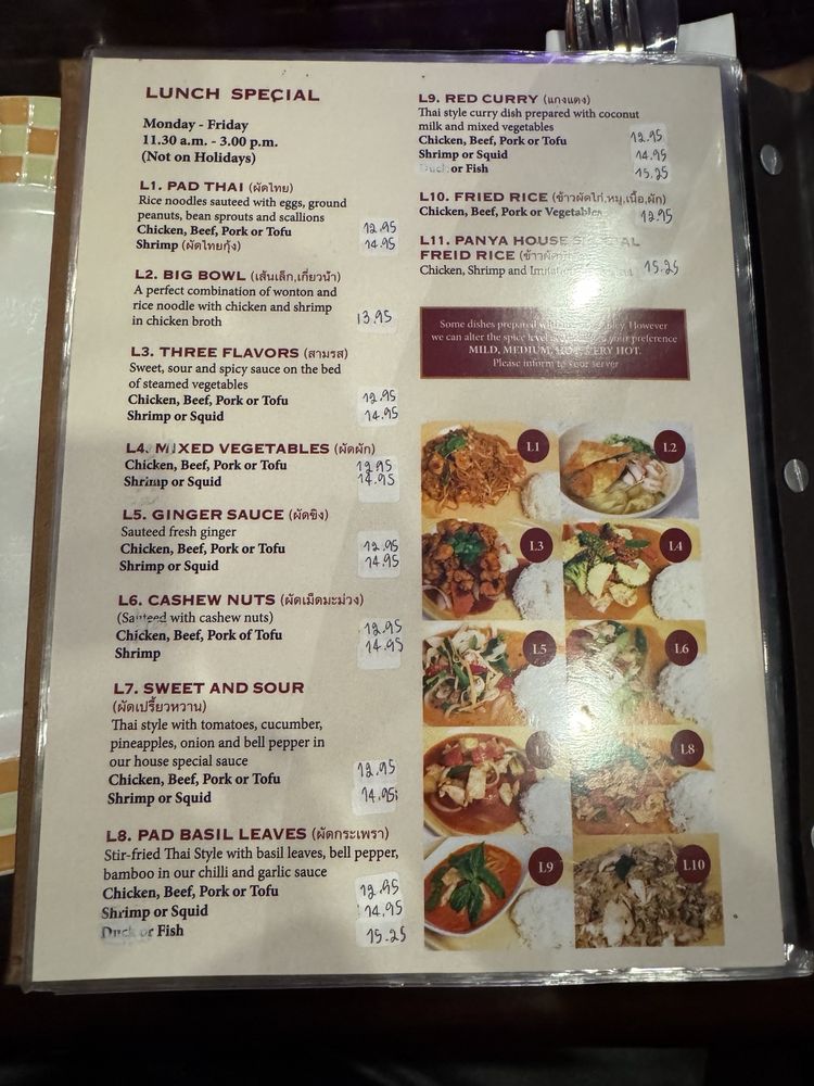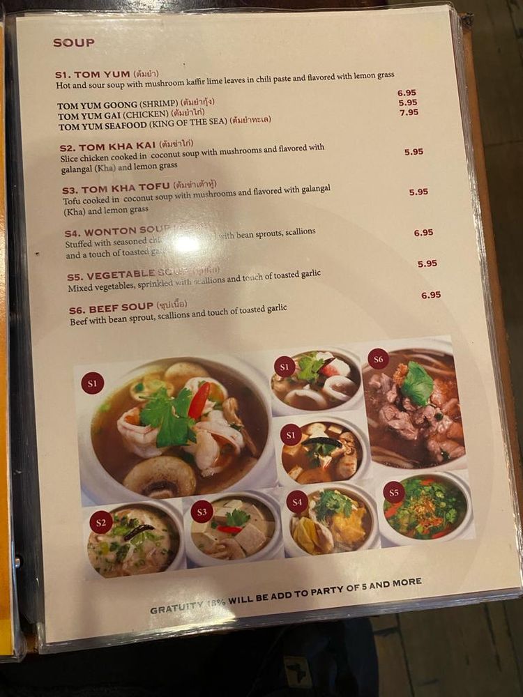 “ FOOD: Panang curry w/ beef was delicious and so flavorful. Pineapple chicken rice was good. I don't even like soup, but the Tom Kha Kai is the soup made with coconut, lemon grass, mushroom was out of this world!!! All the food here was authentic and perfectly flavored. SERVICE: Experienced servers there were nice, but one was awkward during interactions. When I asked to please let me keep the menu for a while, it was placed between the table and the chair. Hard to understand that person as well in the way they spoke, I think English was limited. ”